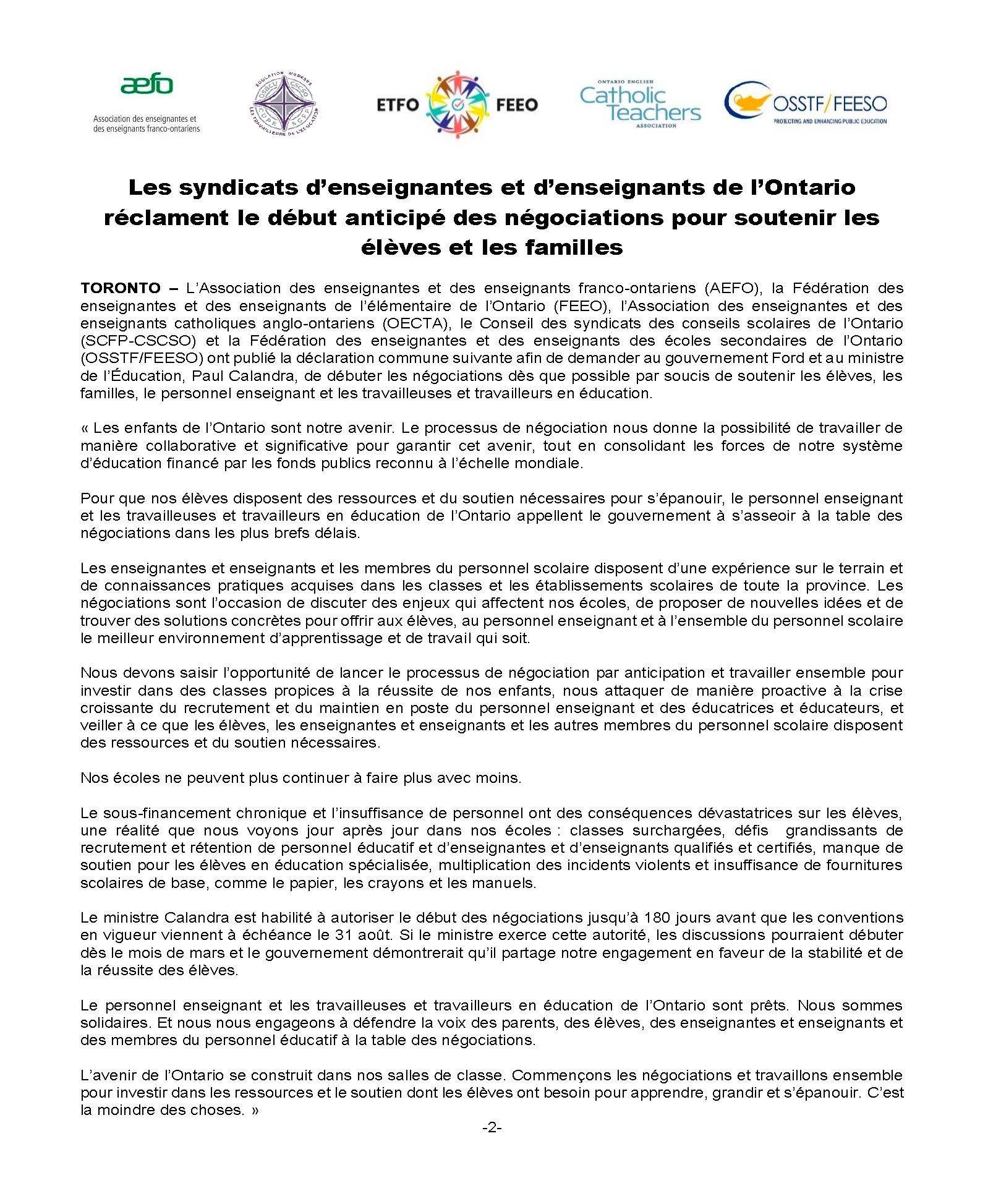 TORONTO – L’Association des enseignantes et des enseignants franco-ontariens (AEFO), la Fédération des enseignantes et des enseignants de l’élémentaire de l’Ontario (FEEO), l’Association des enseignantes et des enseignants catholiques anglo-ontariens (OECTA), le Conseil des syndicats des conseils scolaires de l’Ontario (SCFP-CSCSO) et la Fédération des enseignantes et des enseignants des écoles secondaires de l’Ontario (OSSTF/FEESO) ont publié la déclaration commune suivante afin de demander au gouvernement Ford et au ministre de l’Éducation, Paul Calandra, de débuter les négociations dès que possible par soucis de soutenir les élèves, les familles, le personnel enseignant et les travailleuses et travailleurs en éducation.
